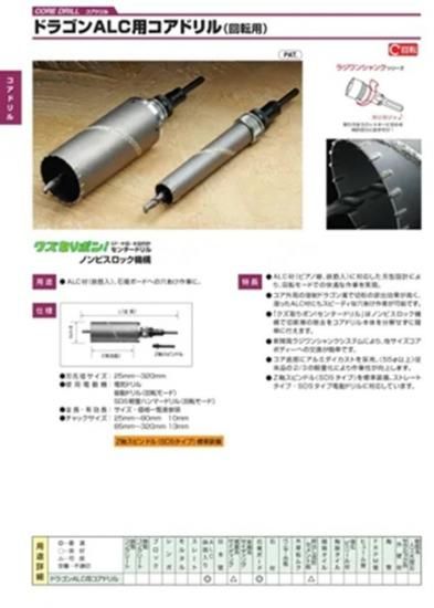・コア外周の溶射ドラゴン溝で切粉の排出効果が高く、湿ったALC材にもスピーディな穴あけ作業が可能です。