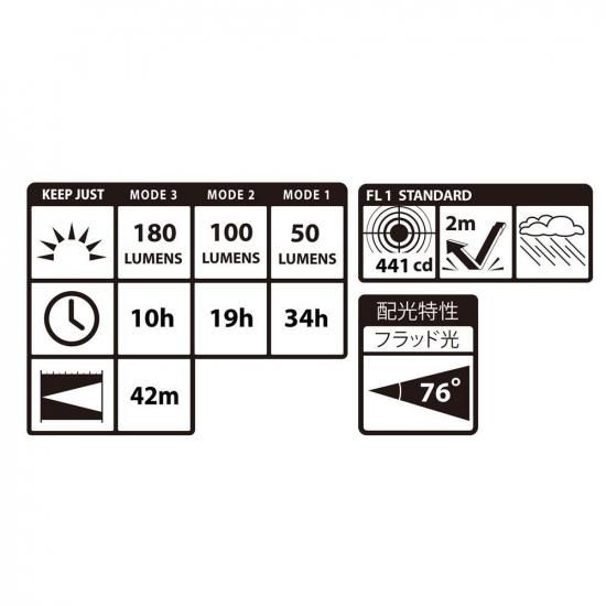 ・連続使用時間:モード1 50lm(130lx):34h、モード2 100lm(270lx):19h、180lm(500lx):10h