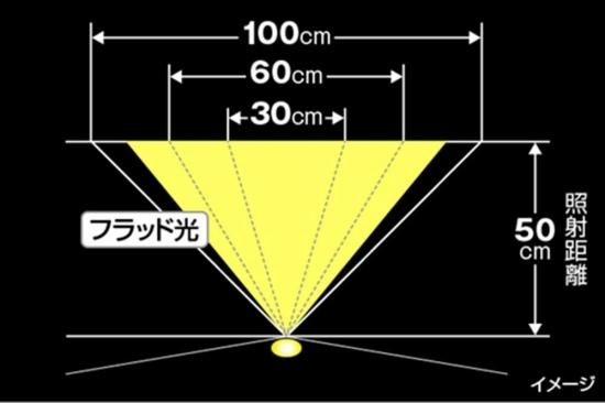 「フラッド光」本体からムラなく照射され、明るさが0%になる角度を表します