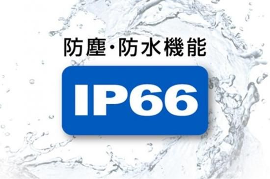 IP66準拠、耐落下2m。防塵:IP6X(完全な防塵構造) 防水:IPX6(あらゆる方向からの噴流水による有害な影響がないレベル)